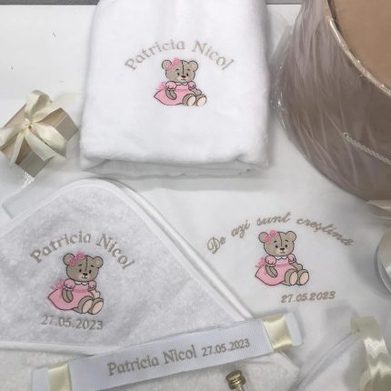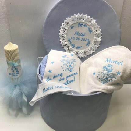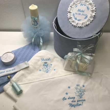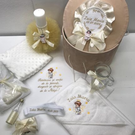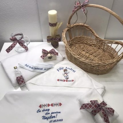 Trusoul conţine:Prosop cu Capişon bumbac Personalizat,Pânză de mir Personalizată,Pătură,Prosop preot,Săpun,Faşă,Sticlă mir,Carafă,Cutie şuviţă,Cutie Catifea ,Lumânare.
