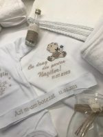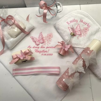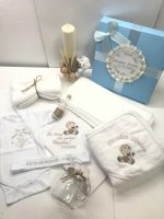 Trusoul conţine:Prosop cu Capişon bumbac Personalizat,Pătură,Pânză de mir Personalizată,Prosop preot,Săpun,Faşă Personalizată,Carafă,Sticlă mir,Cutie şuviţă,Cutie Carton Personalizată,Body Personalizat,Lumânare din ceară naturală 30cm.